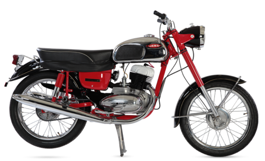 Существовавшая до сих пор конструкция силового агрегата мотоциклов ЯВА была настолько удачна, что и в мотоцикле новой моделе она сохранилась. Два цилиндра, расположенных в ряд поперек оси мотоцикла, наклонены вперед на 25°. Расположение кривошипно-шатунного механизма, коробки передач и моторной передней передачи в общем картере двигателя осталось таким же, как в предыдущих моделях.